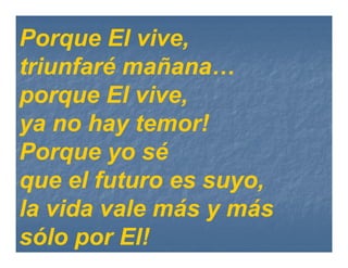 Web Porque El vive Diego Ibárcena Letra A-A. Web G D Porque El vive ya no hay temor. Web Porque él vive seguro estoy Porque yo sí yo sí que el futuro es suyo Y que la vida vale porque él vive hoy. El vive en mí vivo feliz.